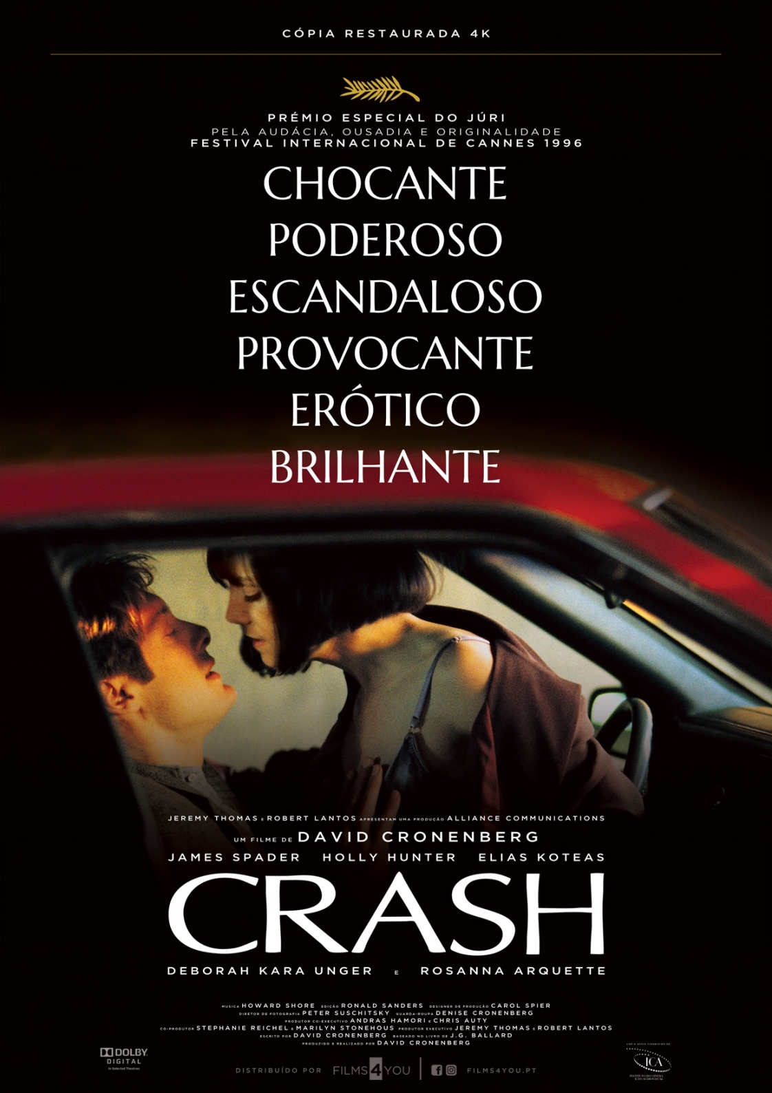 Um dos maiores êxitos da carreira de David Cronenberg e, também, um dos seus filmes mais controversos e polémicos. Adaptado do romance de J.G. Ballard, “Crash” é um filme demencial sobre o fascínio do sexo e da morte sobre rodas. Trata-se de uma macabra visão sobre a combinação entre erotismo e mutilação, autodestruição calculada e desejo sexual, morte violenta e acidentes rodoviários. James Ballard (James Spader), um produtor de filmes publicitários, tem um grave acidente de viação ao colidir com outro automóvel, que resulta na morte do outro condutor e deixa a mulher dele ferida. No hospital, Ballard perde-se e volta a encontrar Helen Remington (Holly Hunter), a viúva da vítima mortal do acidente. Na sua companhia conhece Vaughan (Elias Koteas), um cientista e fotógrafo fascinado pela beleza erótica dos ferimentos e das mutilações originadas por acidentes de viação. Ballard começa por se sentir curioso em relação a Vaughan e às suas ideias de recriar acidentes célebres, como o que vitimou James Dean. E, a pouco e pouco, deixa-se contagiar pelo erotismo que emerge da insólita combinação.