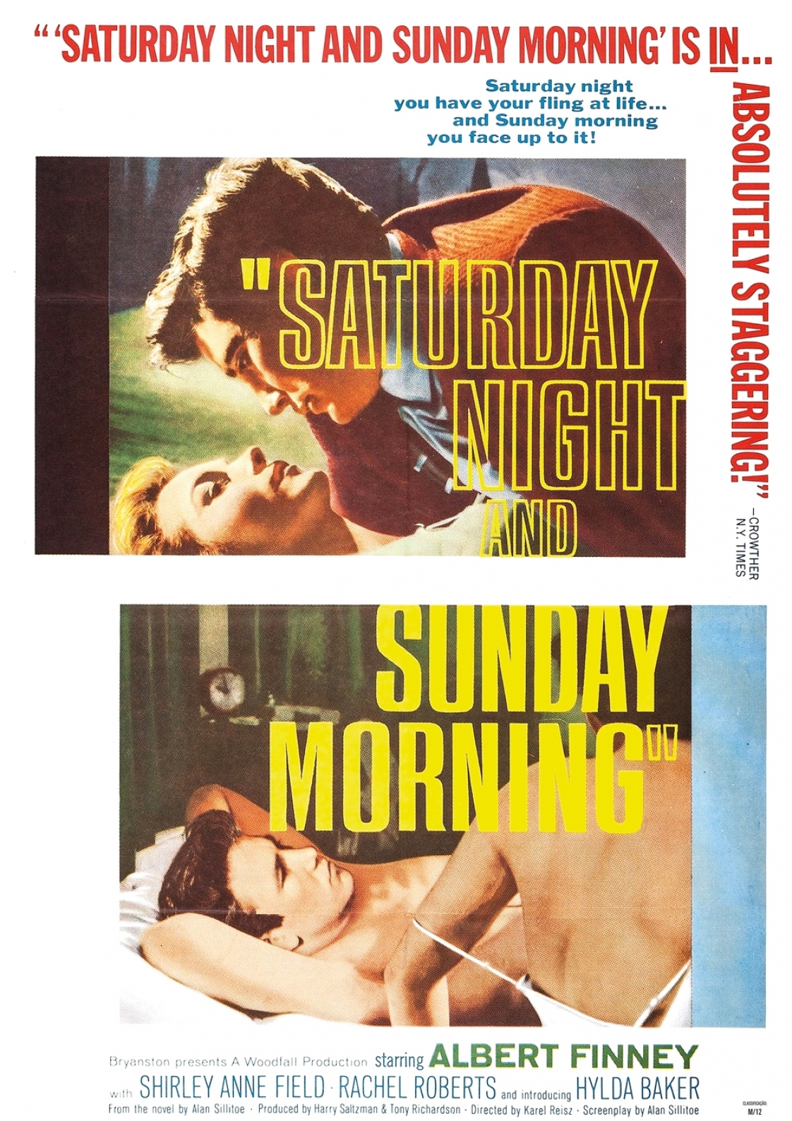 No seguimento do trabalho documental que realizara nos anos cinquenta sob o signo do free cinema, o cinema de ficção de Reisz mantém o seu foco na juventude marginalizada da classe trabalhadora, revelando assim uma mesma dimensão realista e preocupação social. Em Saturday Night and Sunday Morning, o nosso (anti-) herói é Arthur Seaton, mais um “angry young man” cujo grito de ordem “Don’t let the bastards grind you down!” se tornaria um símbolo incontornável da nova vaga inglesa. Celebremente interpretado por Albert Finney, Seaton representa uma personagem-arquétipo que, chegados ao início da década de 60, se tornara familiar às audiências britânicas.